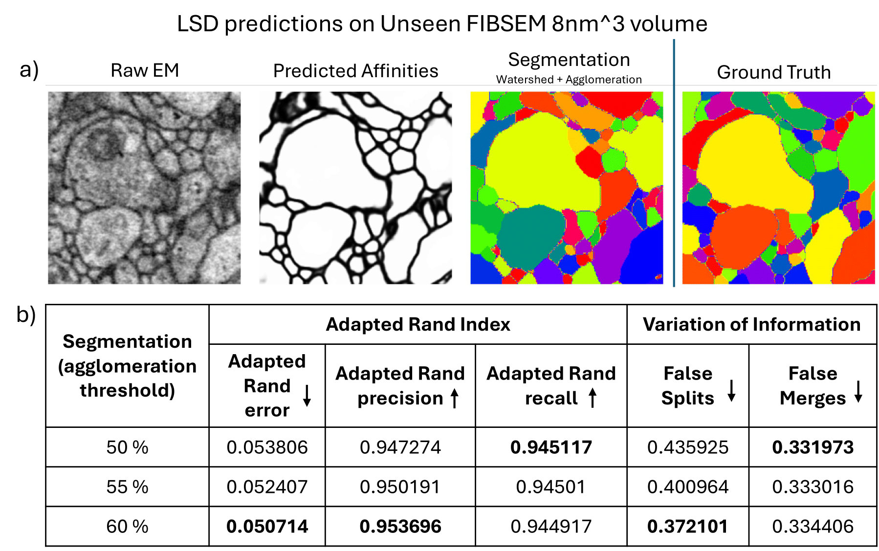 8nm^3, FIBSEM;~40microns) dataset on Octo (resolution:8nm^3, FIBSEM;20 x 200 x 200Roi in zyx) achieves~0.05Adapted Rand Error for a segmentation for agglomeration thresholds50%-60%.