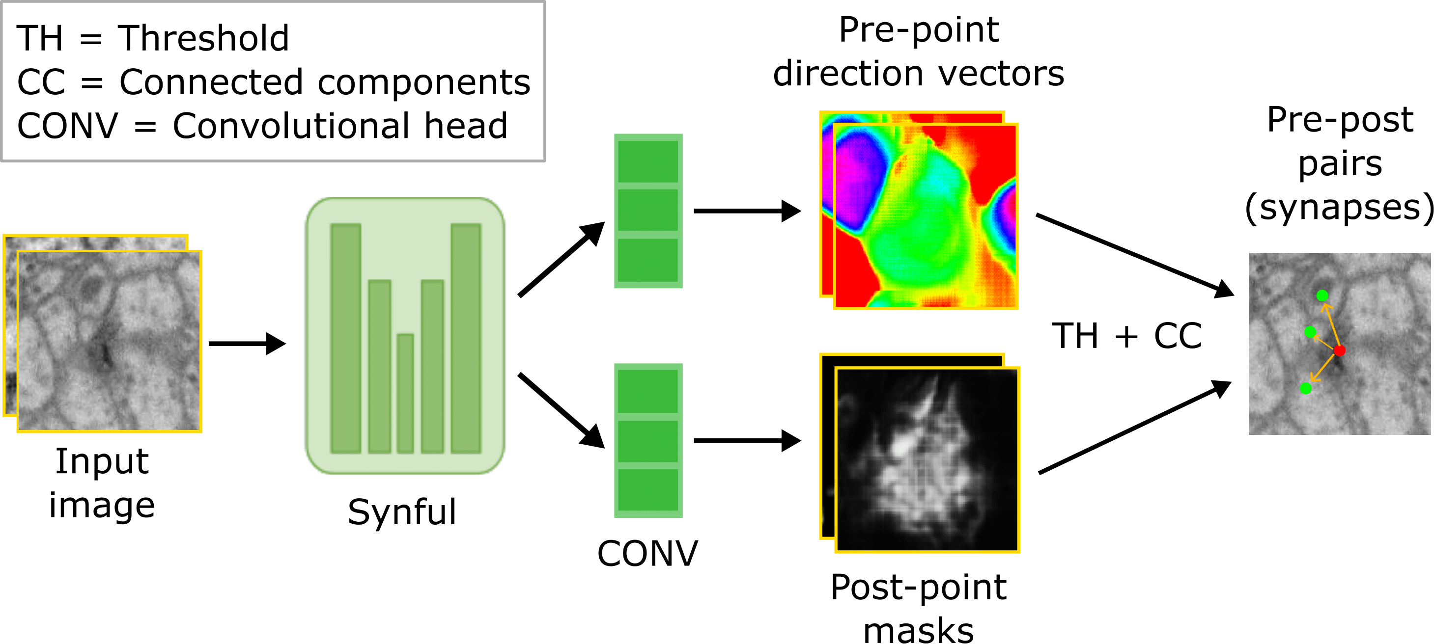 Synful implements the partner-detection approach from Julia Buhmann et al.'s paper, Automatic detection of synaptic partners in a whole-brain Drosophila electron microscopy dataset. It uses a U-Net-style encoder-decoder to jointly (1) localize post-synaptic sites (potentially annotations are on top of PSDs) and (2) predict a direction vector field from each post-synaptic site toward its pre-synaptic partner. This multi-task setup lets the network learn where synapses are and who they connect to-within a single model.